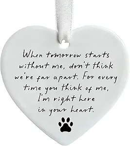 This Pet Memorial Ceramic Heart Keepsake is a beautiful tribute for your beloved pet. Engraved with the heartfelt message \'When Tomorrow Starts Without Me\', this remembrance ornament serves as a touching reminder of the love and joy your pet brought into your life. Perfect for dog or cat owners, this sympathy decor comes with a gift box, making it an ideal choice for anyone experiencing pet loss. The hanging heart design is suitable for display in your home or garden, allowing you to keep your pet\'s memory close to your heart.